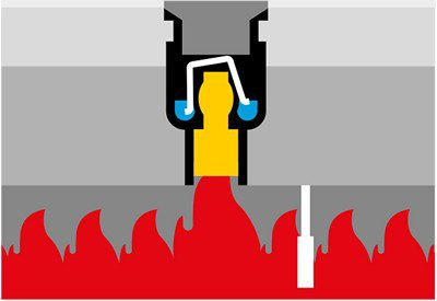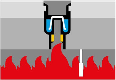 Το ένθετο πυροπροστασίας Fire-Kit διαστέλλεται λόγω της θερμότητας και σφραγίζει εντελώς τα ανοίγματα στο δάπεδο από μπετόν, αποτρέποντας την εξάπλωση της φωτιάς στον επάνω όροφο.
